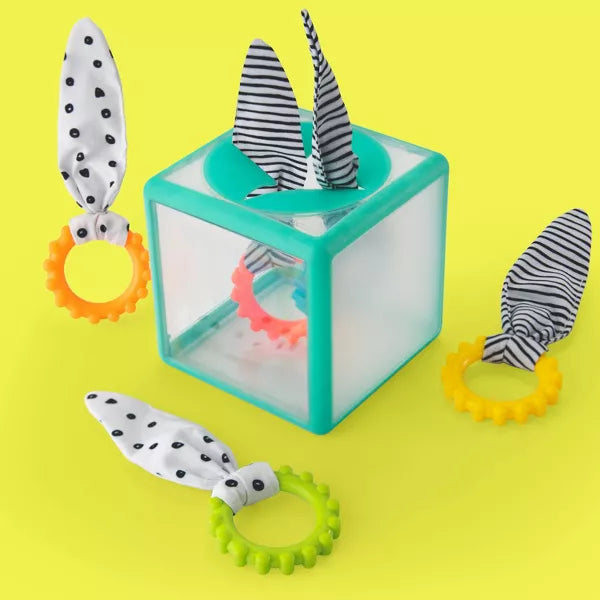 Babies love playing with tissue boxes, so this can be their very own! Clear box with soft top flap opening, to put & take rings with crinkle fabric. The rings are textured and great teethers! Easy to grasp rings have a bold patterned crinkle fabric flag attached to each for a sensory experience. Name the colors as you put them in the box, and the crinkle fabric will help pull the ring out! Each side of the box visually shows something different – a clear panel, a frosted panel, a striped panel, and a magnified panel. Encourages fine motor skills, tactile exploration and experimentation.